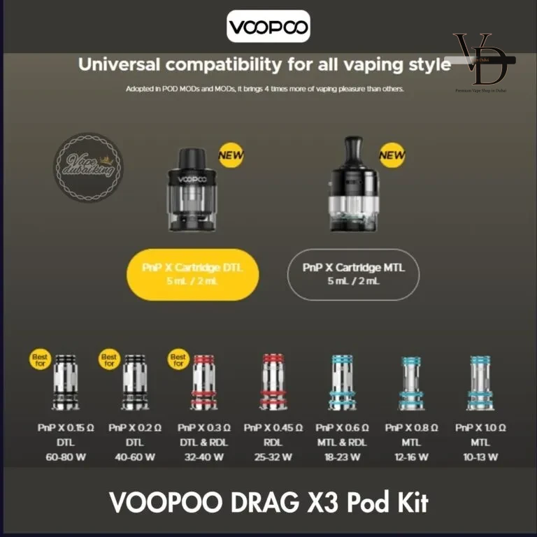 The Voopoo Drag X3 is a user-friendly vape kit perfect for sub-ohm vaping. It runs on one 18650 or 21700 battery (sold separately) and offers 5–80W adjustable power. It will offer you refined taste from MTL to DTL vaping styles with the PnP X Platform Compatible — Works with PnP X cartridge/pods and supports PnP X coils for MTL to DTL styles (choose coil/pod setup as needed).